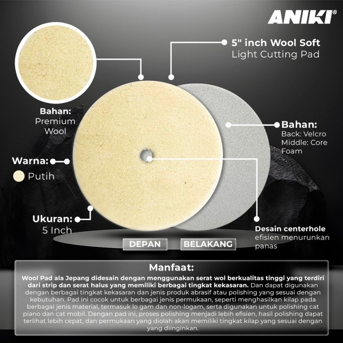Aniki 5″ inch Wool Soft Light Cutting Pad menggunakan wol berkualitas tinggi yang pendek dan padat, sehingga sangat tahan lama dan tidak mudah meninggalkan baret halus. Pad ini memiliki kemampuan cutting yang kuat dan menghasilkan hasil poles yang lebih baik.
