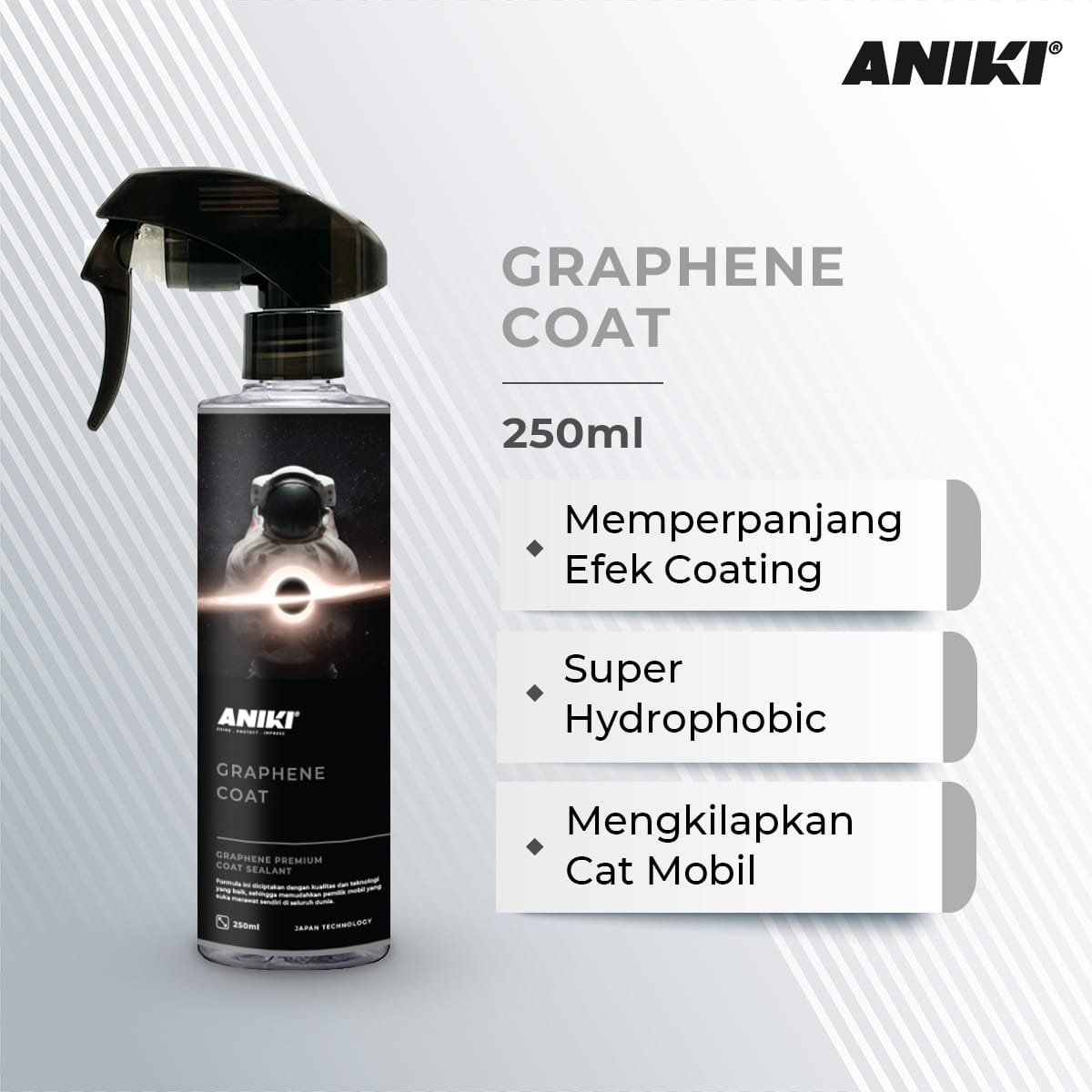Aniki Graphene Coat adalah pelindung dan pelapis nano cat berkonsentrasi tinggi yang dikembangkan dan dibuat dari teknologi Jepang sehingga menghasilkan formula Nanocomposites (Aerographene) yang lebih ringan dari udara dan lebih kuat dari baja. Produk ini memberikan perlindungan serta kilap yang lebih detail, super slick finish dan hydrophobic untuk proteksi yang lebih kuat terhadap cuaca extreme.
