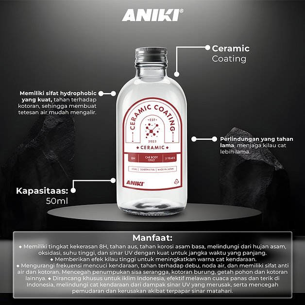 Aniki Ceramic Coating adalah coating berkonsentrasi tinggi yang dikembangkan dan dibuat dari teknologi Jepang. Produk ini membentuk lapisan keramik dengan tingkat kekerasan 8H pada permukaan cat kendaraan, memberikan pantulan kilau yang tinggi, memberikan tampilan permukaan cat yang tebal, serta mampu melindungi permukaan kendaraan Anda selama lebih dari 24 bulan.