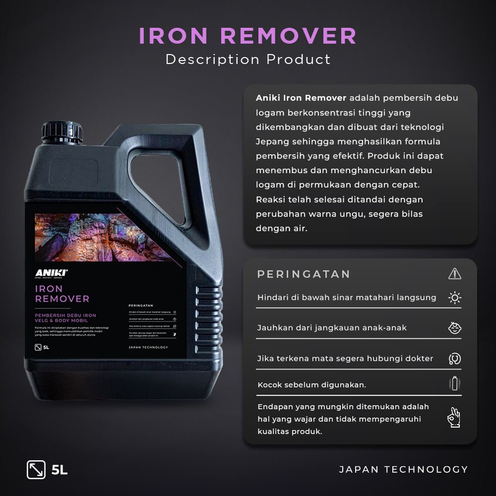 Aniki Iron Remover adalah pembersih debu iron berkonsentrasi tinggi yang dikembangkan dan dibuat dari teknologi Jepang sehingga menghasilkan formula pembersih yang efektif. Produk ini dapat menembus dan menghancurkan debu iron di permukaan dengan cepat. Reaksi telah selesai ditandai dengan perubahan warna ungu, segera bilas dengan air.