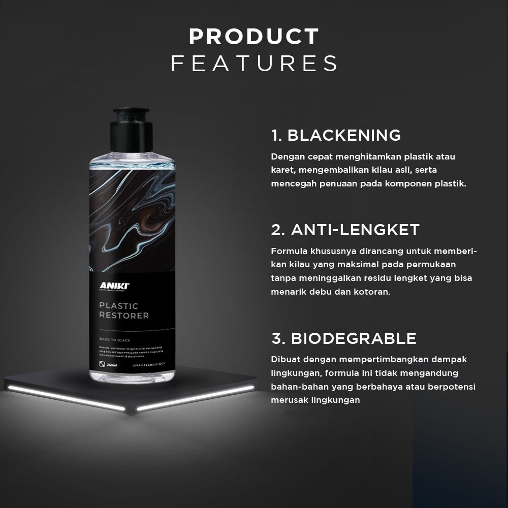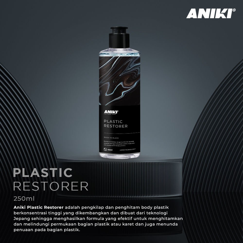 Aniki Plastic Restorer adalah pengkilap dan penghitam body plastik berkonsentrasi tinggi yang dikembangkan dan dibuat dari teknologi Jepang sehingga menghasilkan formula yang efektif untuk menghitamkan dan melindungi permukaan bagian plastik atau karet dan juga menunda penuaan pada bagian plastik.