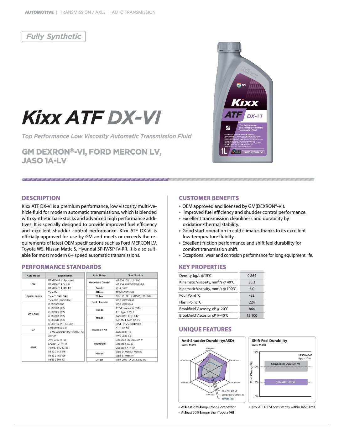 KIXX ATF DX-VI adalah performa premium, liquid dengan viskositas rendah untuk transmisi automatic modern, yang dicampur dengan bahan dasar sintetis dan aditif kinerja tinggi yang canggih. Dirancang khusus untuk memberikan peningkatan efisiensi bahan bakar dan kinerja kontrol getaran yang sangat baik. Kixx ATF DX-VI secara resmi disetujui untuk digunakan oleh GM dan memenuhi atau melampaui persyaratan spesifikasi OEM terbaru seperti Ford MERCON LV, Toyota WS, Nissan Matic S, Hyundai SP-IV / SP-IV-RR. Ini juga cocok untuk sebagian besar transmisi otomatis kecepatan 6+ modern.