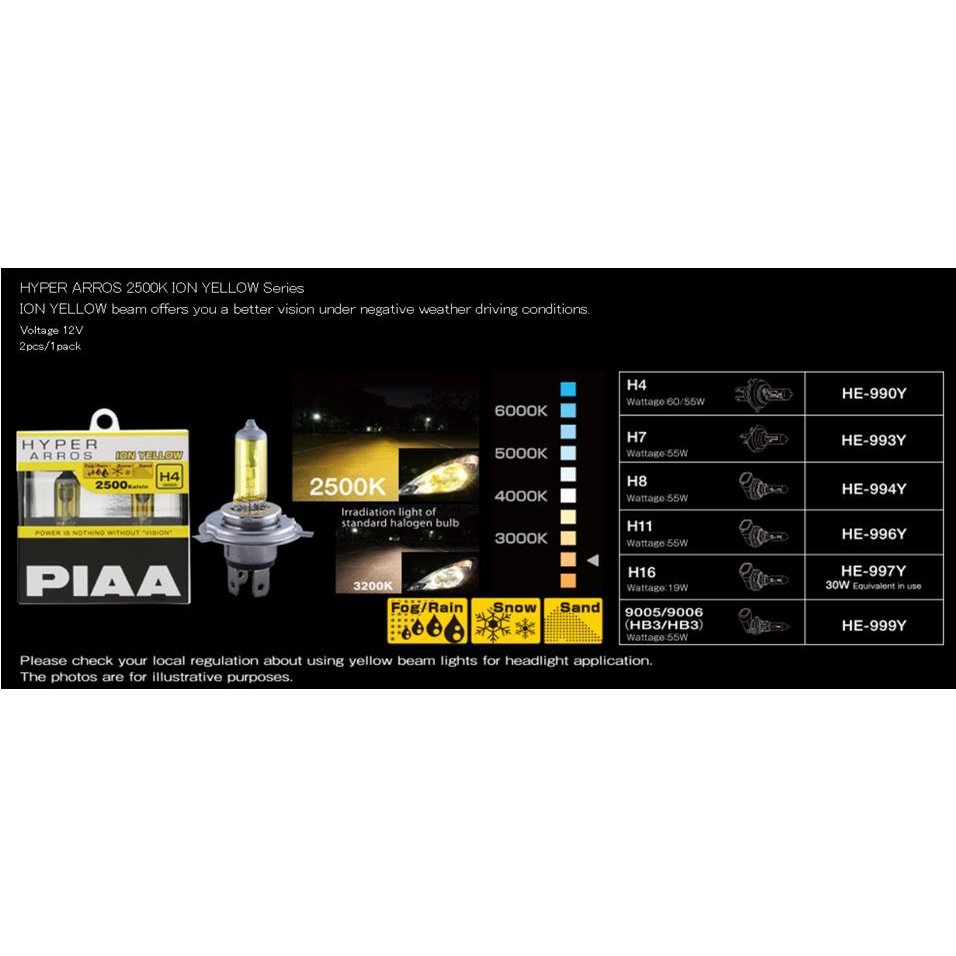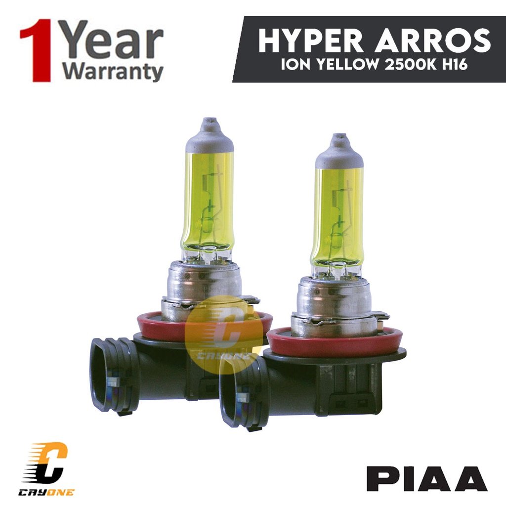 Hyper Arros Ion Yellow merupakan lampu yang dikembangkan jauh lebih unggul, menembus pandangan dibandingkan lampu standar, dengan berbagai elemen alam baik itu hujan, kabut, salju, atau bahkan pasir. Apapun cuacanya, cahaya kuning terang dari Hyper Arros Ion Yellow PIAA akan membuat pandangan Anda tetap jelas dan baik. Dengan suhu lampu yang tidak terlalu tinggi ini masih sangat berguna untuk kondisi cuaca buruk dan penggunaan sehari-hari.