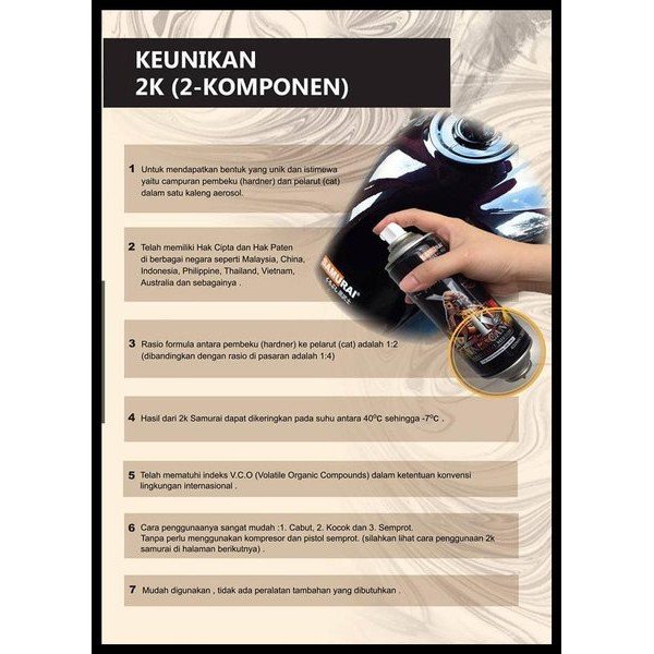Samurai paint adalah cat semprot berkualitas tinggi dengan formulasi jepang memberikan hasil yang maksimal, mudah pengaplikasian ke media kayu,besi,plastik dengan hasil yang sempurna
