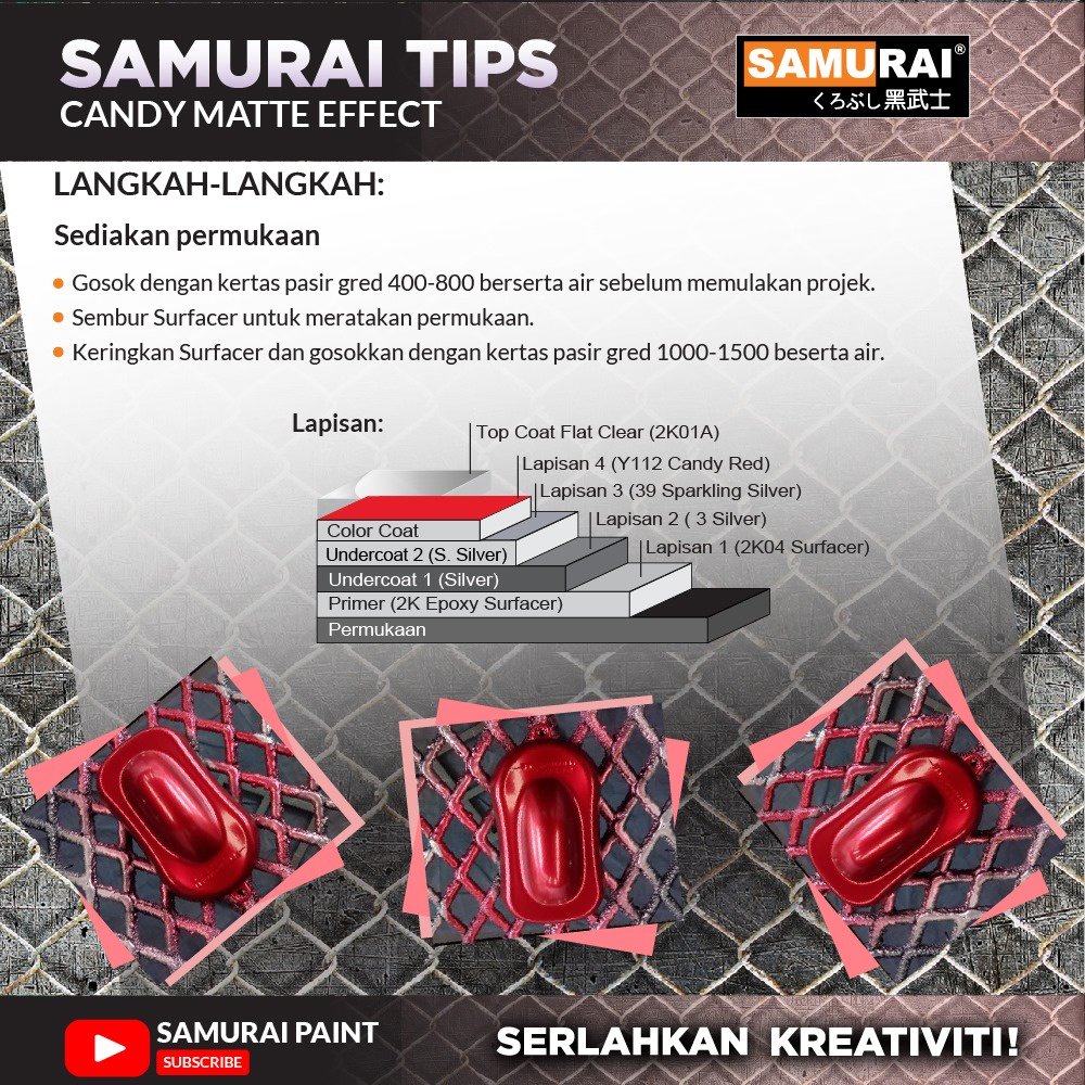 Samurai paint adalah cat semprot berkualitas tinggi dengan formulasi jepang memberikan hasil yang maksimal, mudah pengaplikasian ke media kayu,besi,plastik dengan hasil yang sempurna