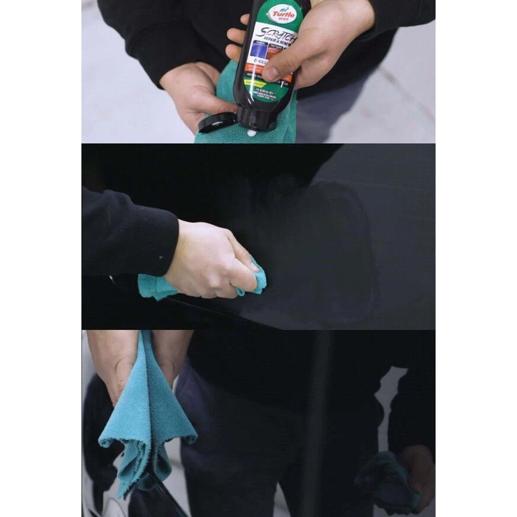 3. Tuangkan Turtle Wax Scratch Repair & Renew ke kain ataupun busa aplikator pad lalu aplikasikan pada bidang ataupun panel cat, gosok dengan kuat maju mundur selama 30 detik sampai noda ataupun goresan halus pada permukaan cat menghilang.