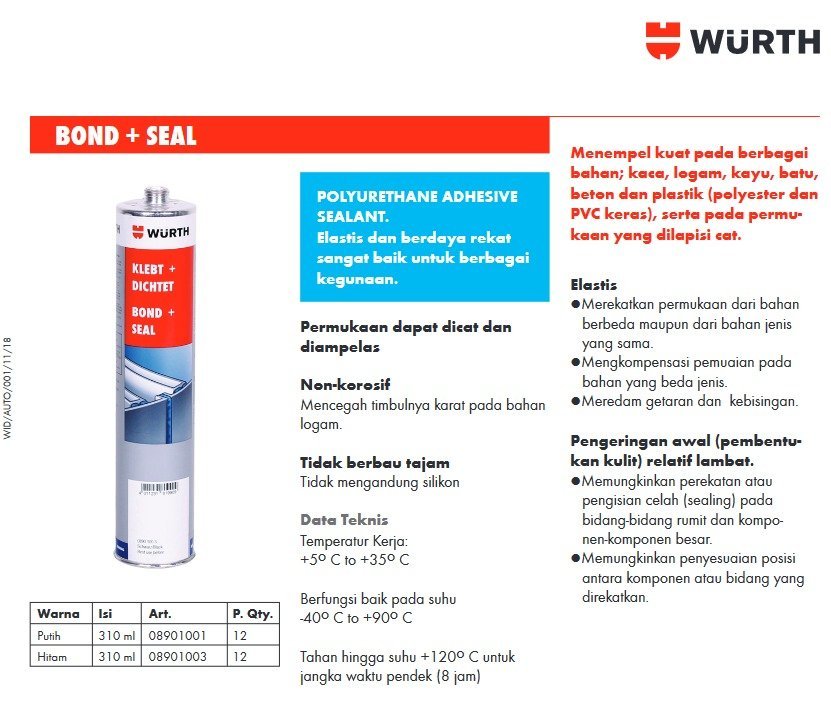 WURTH Bond + Seal Structural Adhesive Sealant – Lem Sealer Perekat Multifungsi Kaca dan Komponen Logam